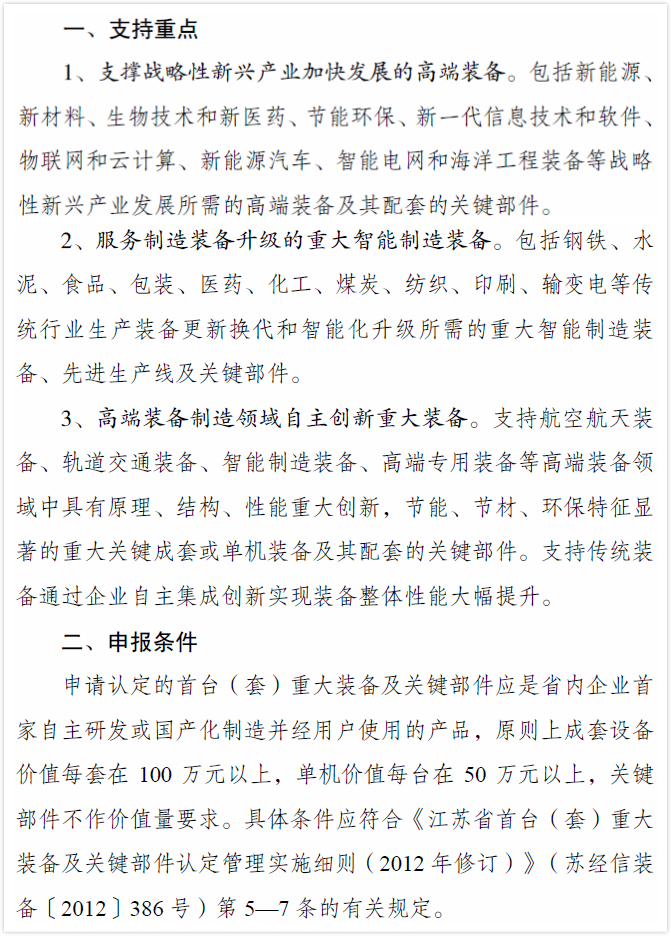 2、申报首台(套)重大装备及关键部件示范应用项目必须提前完成江苏省首台(套)重大装备及关键部件认定工作;