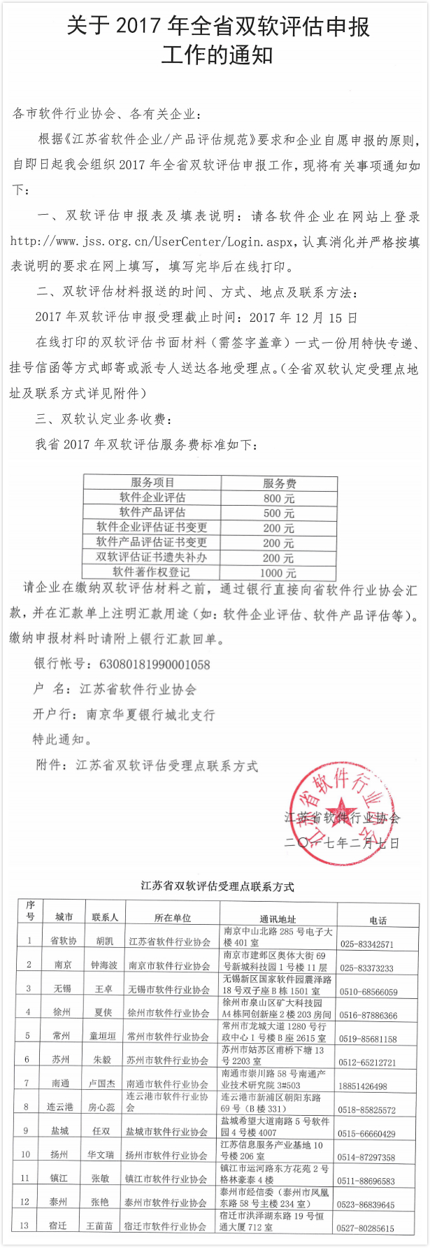 核心提示:各市软件行业协会、各有关企业:根据《江苏省软件企业/产品评估规范》要求和企业自愿申报的原则,自即日起我会组织2017年全省双软评估申报工作,现将有关事项通知如下
