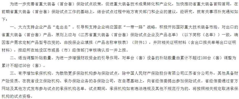 (3)首台套保险试点项目:支持具有自主知识产权、附加值高、市场前景广、带动性强的省重大装备(首台套)突破市场推广应用初期的瓶颈。